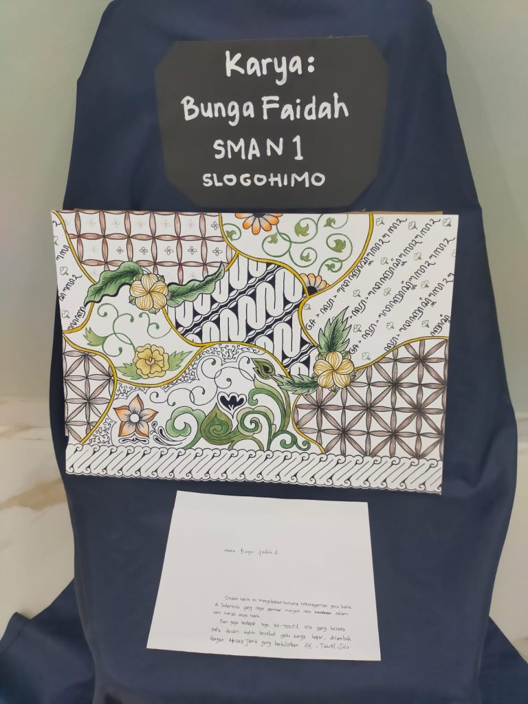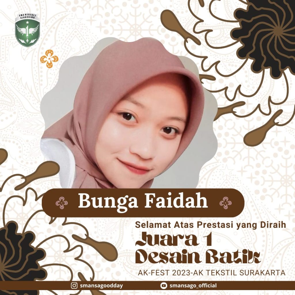 SMANSAGO memiliki Program Life Skill yang salah satunya adalah life skill desain grafis yang diampu oleh Arif Agung Santoso, S. Pd. Pada perlombaan kali ini SMANSAGO mengirimkan tiga siswa untuk mengikuti lomba Desain Batik yakni Laila (X 5), Bunga Faidah (XI IPS 3), Alika (XI IPS 1) dan salah satu diantaranya berhasil menjadi Juara 1. Ia adalah Bunga Faidah yang duduk di kelas XI IPS 3 yang telah mengalahkan 22 peserta lainnya. “Desain batik yang menjelaskan tentang keberagaman jenis batik di Indonesia yang saya gambar menjadi salah satu dalam satu karya desain batik. Dan juga terdapat logo AK-Tekstil Solo yang berada pada desain batik tersebut yakni bunga kapas, ditambah dengan Aksara Jawa yang bertuliskan AK-Tekstil Solo” tulis Bunga dalam karyanya, yaa… Desain batik yang cantik dan syarat makna tersebut mampu menyentuh hati juri hingga mengantarkan Bunga Fadilah menjadi juara utama.
